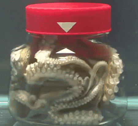 当然诸如此类能突出章鱼聪明的真实案例还有很多,比如下面这张打开瓶盖的图片,想必大家都曾见过,其他的就不一一例举了。