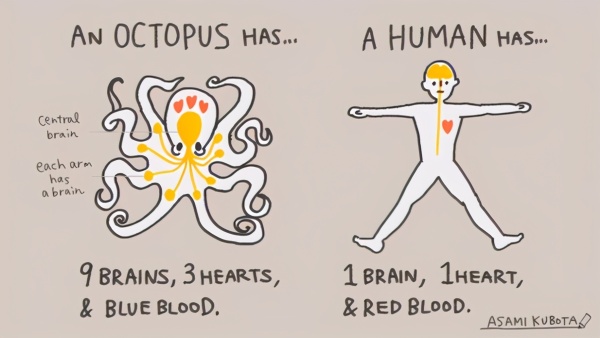 言归正传,章鱼的主要大脑占据40%神经元,其余60%则被8个次要大脑平分。