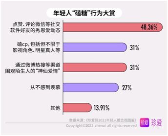 无论是否期待对的人到来,单身青年都乐于围观他人的神仙爱情,调研中48.36%的用户会给社交软件好友的秀恩爱动态点赞,31%的人会通过磕cp、恋爱相关微博热搜获取爱情“糖分”。