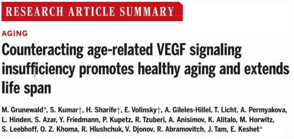 这是学界在缞老研究领域,一次全新的突破。以色列科学家在实验中发现,通过增强血液中一种细胞生长因子VEGF的信号通路,不仅能够增加生物体健康生存期,还能延长其寿命的50%。研究结果一举登上国际顶级期刊《Science》,由耶路撒冷希伯来大学E. Keshet研究组与M. Grunewald主导。